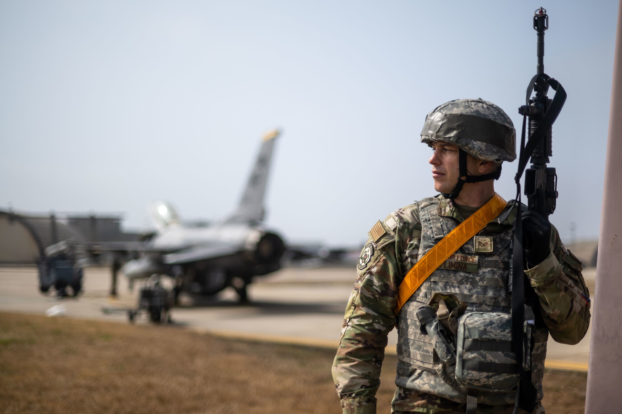 Airman 1st Class Juan Mendoza, right, 80th Fighter Generation Squadron dedicated crew chief, salutes Maj. Rex Anderson, 8th Fighter Wing weapons officer, during an F-16 Fighting Falcon launch as part of Beverly Sentinel 24-1 at Kunsan Air Base, Republic of Korea, March 27, 2024. 8th FW Airmen remain agile and armed as a combat-credible force. Exercising procedures like general arming confirms the Pack’s ability to, if called upon, rapidly enter a contingent environment in defense of the ROK. (U.S. Air Force photo by Senior Airman Karla Parra)