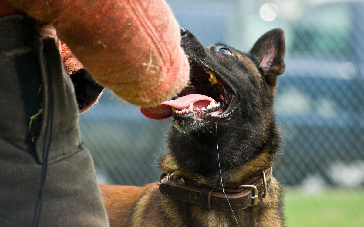 A military working dog clamps its jaws around the arm of Maj. Brian Snyder, 8th Communication Squadron commander, during a training exercise at Kunsan Air Base, Republic of Korea, June 15, 2012. The K-9 is trained to not let go until it is given a command by its handler. (U.S. Air Force photo/Staff Sgt. Michael Schocker)