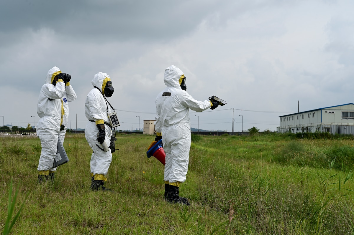 Senior Airman Desmond Hazeur, 8th Civil Engineer Squadron emergency management journeyman, applies chemical resistant tape around the gas mask of Airman 1st Class Vanessa Nogueda-Castaneda, 8th CES emergency management journeyman, at Kunsan Air Base, Republic of Korea, Sept. 18, 2025. These Airmen were tasked with detecting simulated nuclear radiation and chemical hazards during an 8th CES emergency management nuclear weapon incident training exercise. (U.S. Air Force photo by Senior Airman Karissa Dick.)
