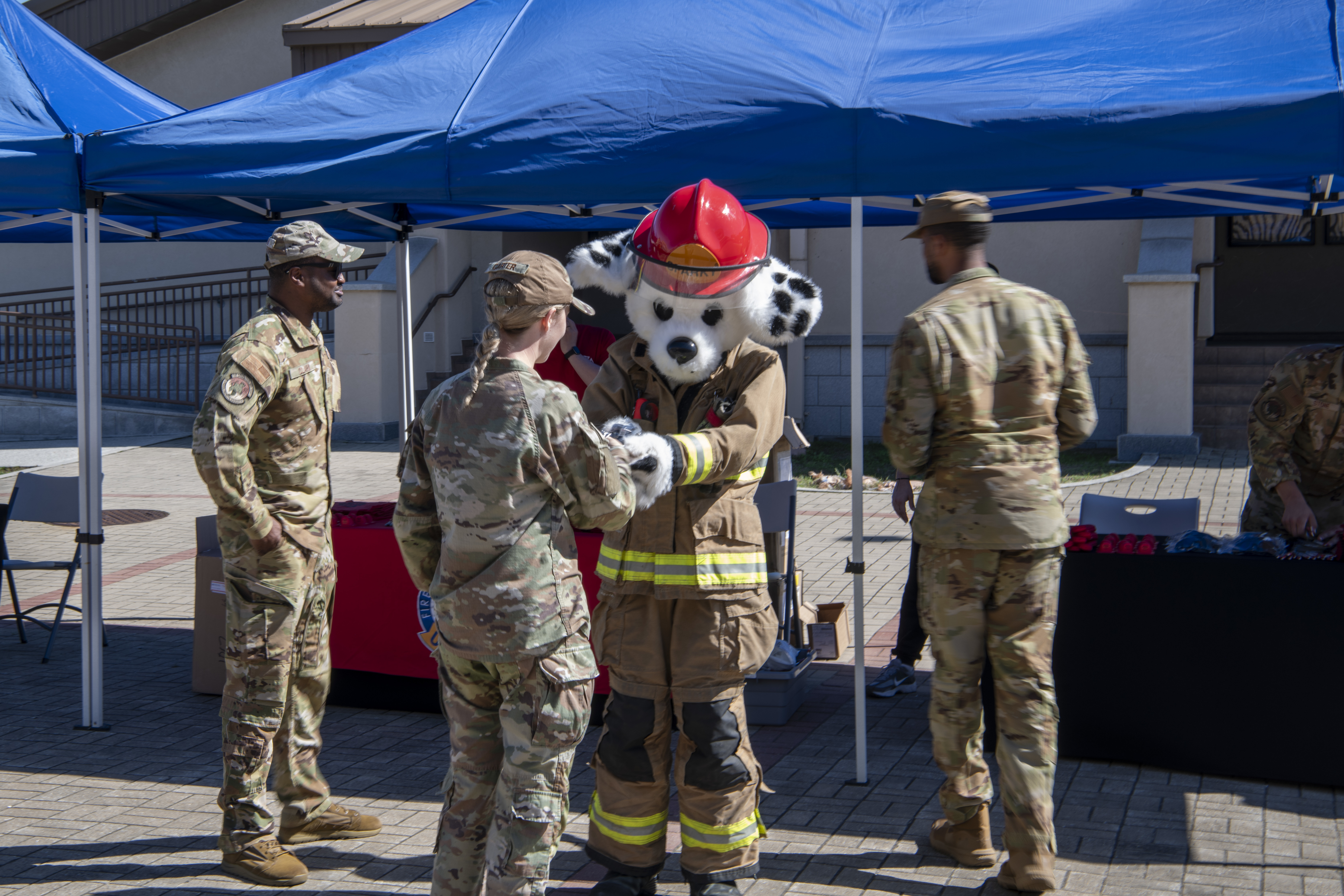 Sparky, the 8th Civil Engineer Squadron mascot, closes the door to a fire truck during Fire Prevention Week at Kunsan Air Base, Republic of Korea, Oct. 8, 2025. During the week, the 8th CES firefighters hosted a Fire Prevention Week proclamation signing, an information and safety display and visited various units across the base. (U.S. Air Force courtesy photo)