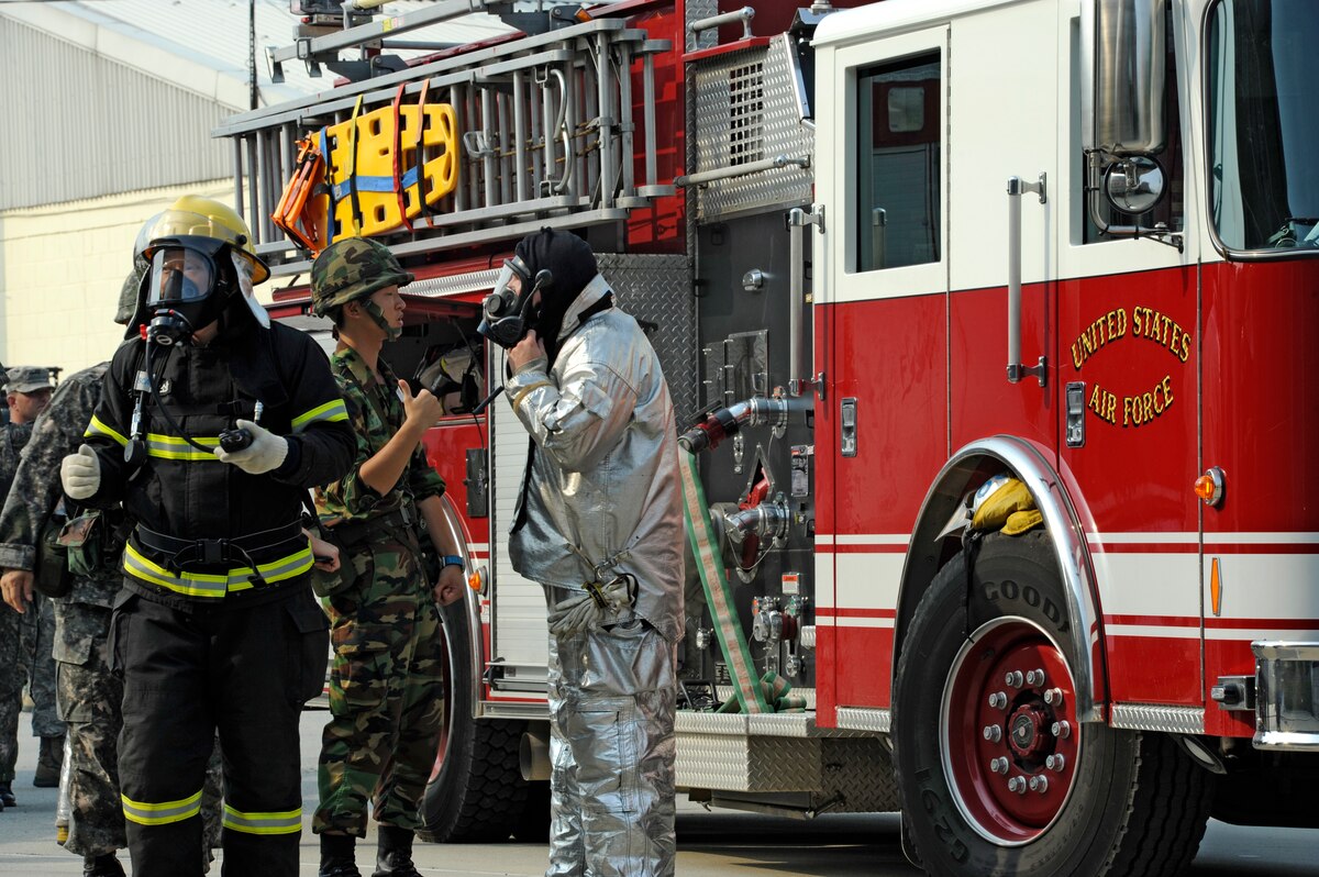 KUNSAN AIR BASE, Republic of Korea – Staff Sgt. Bryan Bereza, 8th Civil Engineer Squadron fire department company officer, and Senior Airman Brandon Shaw, 8th CES fire department crew member, make their way up to the third floor of a Republic of Korea air force dormitory during exercise Beverly Midnight 13-3, Aug. 7, 2013. The Fire Dogs searched every room for injured airmen while fighting a simulated fire on the third floor. (U.S. Air Force photo by Staff Sgt. Jessica Haas/Released)