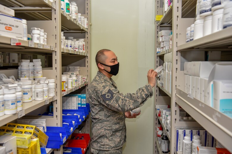 U.S. Air Force Tech. Sgt. Tyrone Rocha, 8th Medical Support Squadron NCO in charge of pharmaceutical services, checks inventory at Kunsan Air Base, Republic of Korea, May 6, 2020. The pharmacy team provides medical support to over 2,500 members of the Wolf Pack to keep them fit to fight. (U.S. Air Force photo by Tech. Sgt. Joshua Arends)