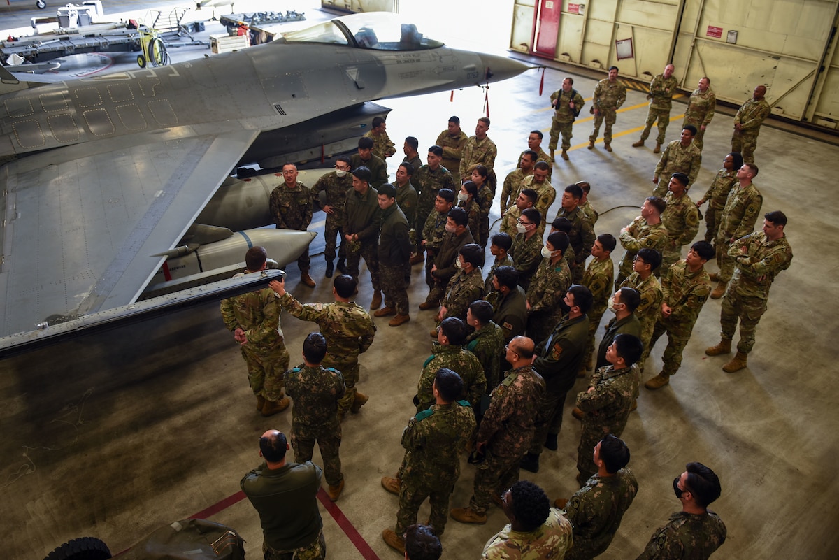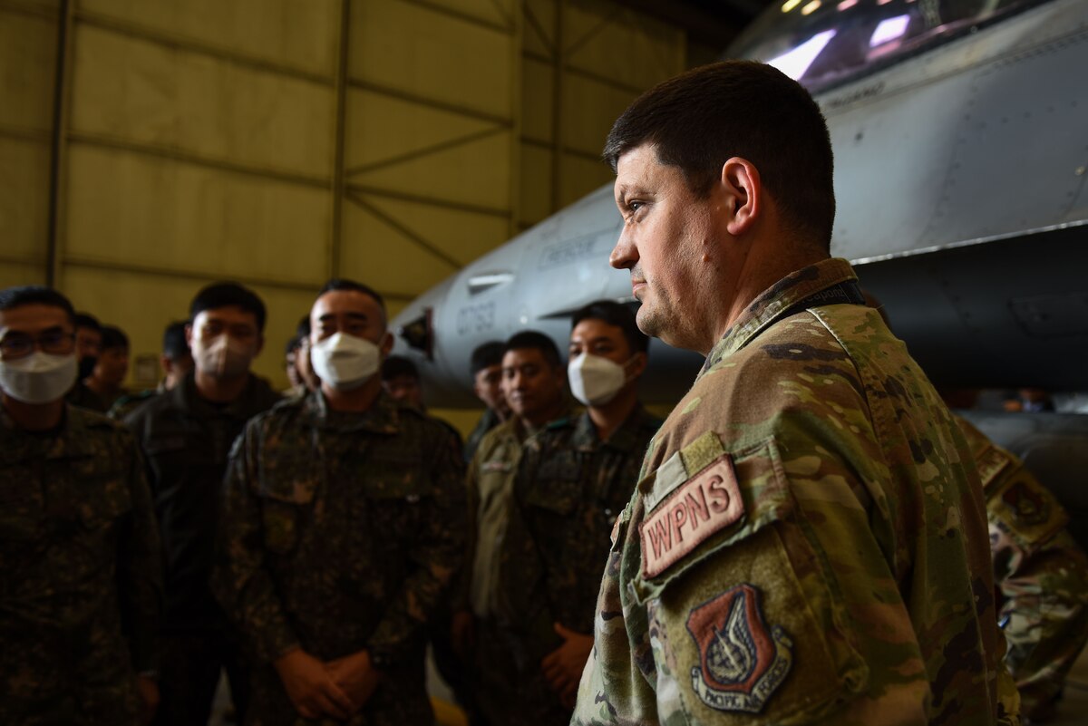 KUNSAN AIR BASE, Republic of Korea -- The Republic of Korea Army 35th Infantry Division along with U.S. Army Soldiers joined the 8th Maintenance Group for a flightline immersion tour at Kunsan Air Base, Republic of Korea, Nov. 8, 2022. During the event, all parties toured the flightline where they learned more about the F-16 Fighting Falcon’s weapons capabilities and what it takes to launch the versatile aircraft from the flightline for a routine sortie.