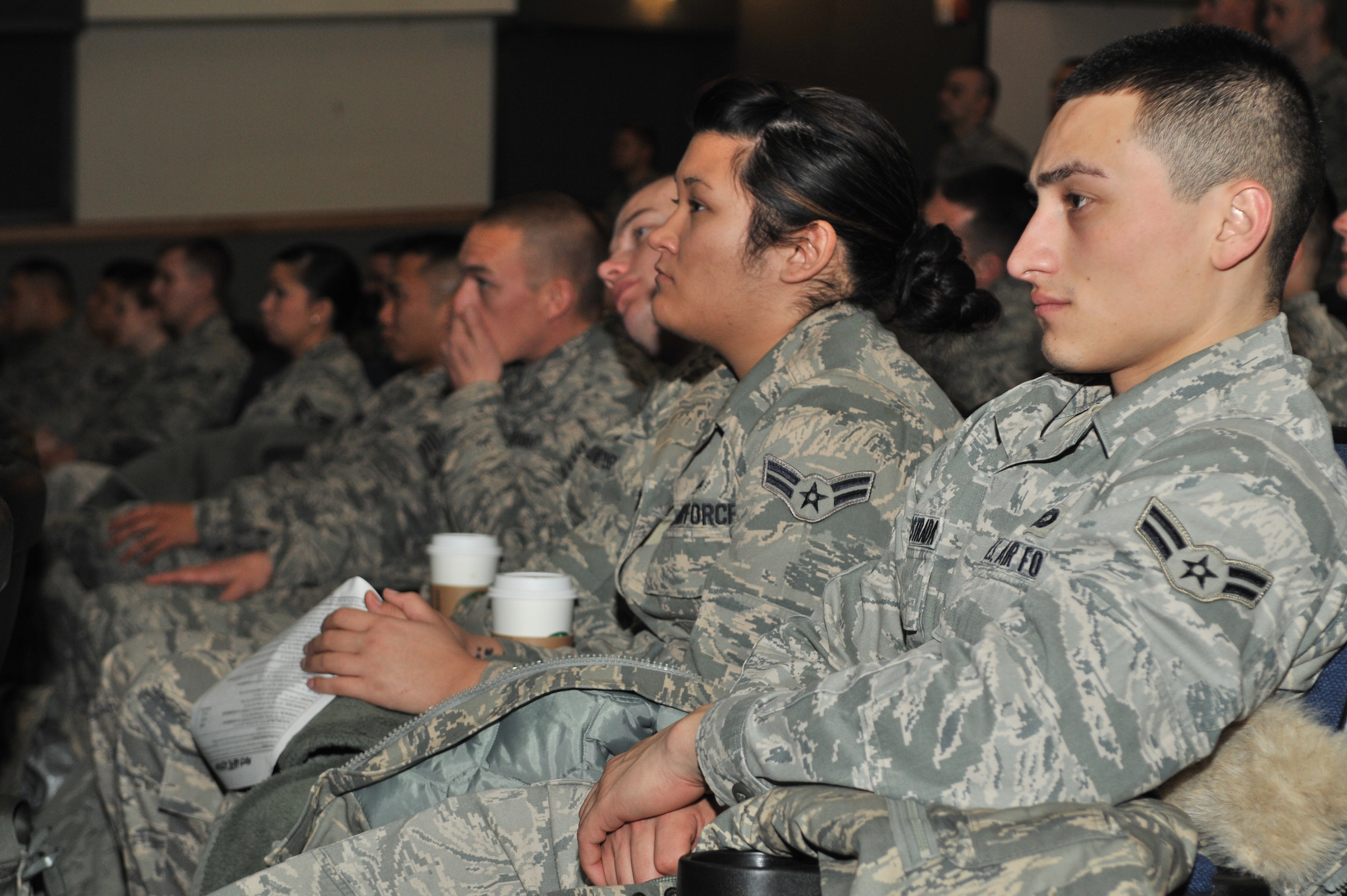 Airmen attend the newcomers’ briefing given by Col. Scott Pleus, 8th Fighter Wing commander at Kunsan Air Base, Republic of Korea, Feb. 9, 2012. Pleus briefed Airmen on 8th FW history, expectations, living conditions and mission. (U.S. Air Force photo by Senior Airman Brittany Y. Auld/Released)