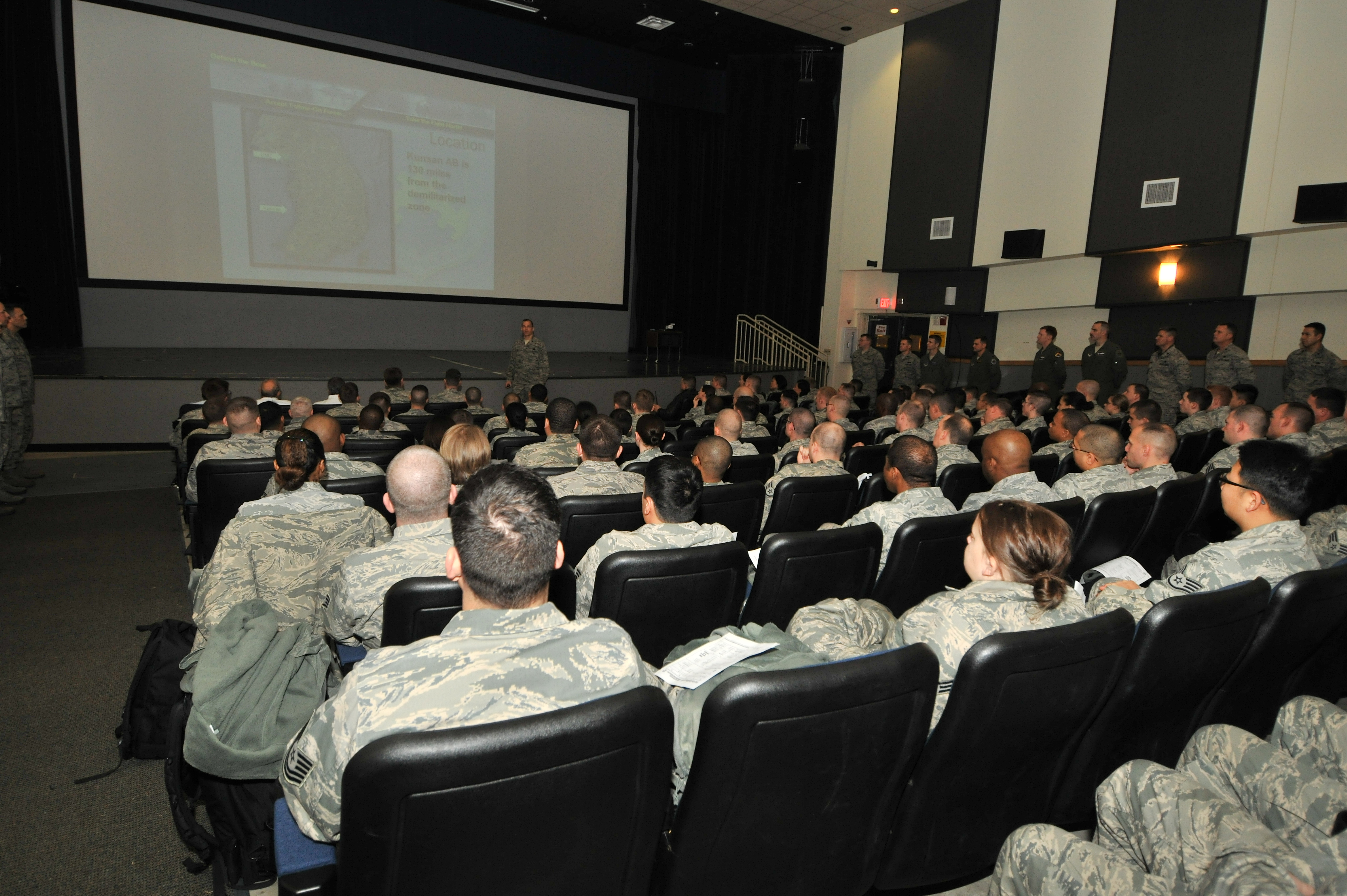 Col. Scott Pleus, 8th Fighter Wing commander briefs new Airmen arriving on station Feb. 9, 2012 at Kunsan Air Base, Republic of Korea. Pleus briefed Airmen on 8th FW history, expectations, living conditions and mission. (U.S. Air Force photo by Senior Airman Brittany Y. Auld/Released)