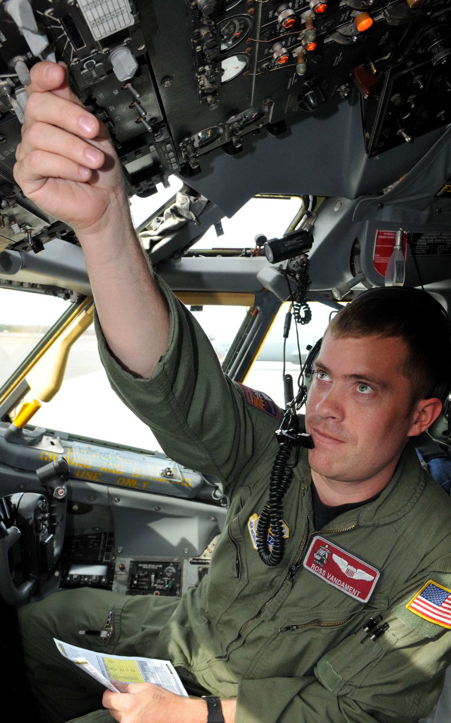 1st Lt. Ross Vandament, a KC-135 Stratotanker pilot with the 22nd Air Refueling Wing, McConnell Air Force Base, Kansas, performs pre-flight checks before flying a refueling mission during Red Flag-Alaska, at Eielson Air Force Base, Alaska April 19. Red Flag-Alaska is a joint offensive counter-air, interdiction, close air support, and large force employment training in a simulated combat environment. (U.S. Air Force photo/Capt. Shannon Collins)