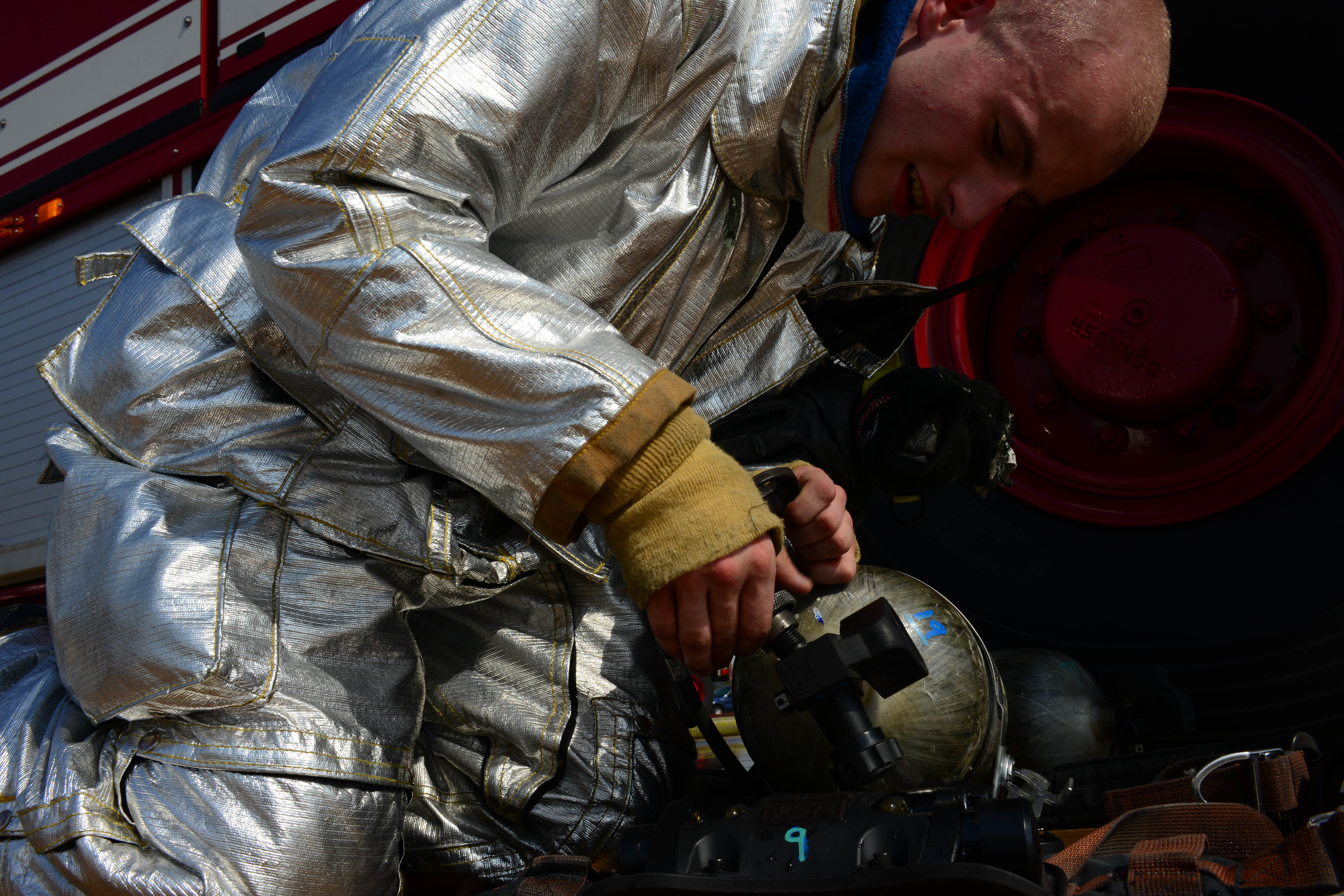 U.S. Air Force Senior Airman Joseph Cappel, 8th Civil Engineer Squadron driver operator kneels down to disassemble his equipment after an aircraft fire exercise during Beverly Pack 16-1 at Kunsan Air Base, Republic of Korea, Oct. 07, 2015. Along with the task of fighting fires the result ends with smoke which requires the oxygen tanks and mask to be taken care of for effective usage. (U.S. Air Force photo by Senior Airman Ashley L. Gardner/Released)